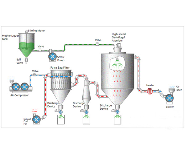 空气经过滤和加热,进入干燥器顶部空气分配器,热空气呈螺旋状均匀地进入干燥室。料液经塔体顶部的高速离心雾化器,(旋转)喷雾成极细微的雾状液珠,与热空气并流接触在极短的时间内可干燥为成品。成品连续地由干燥塔底部和旋风分离器中输出,废气由风机排空。