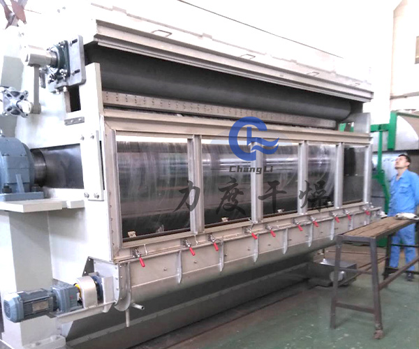 4、干燥时间短:物料的干燥周期一般只有10-300秒,在适合于热敏性物料。若将滚筒干燥机设置在真空器中,则可在减压条件下运行。