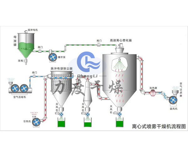 在干燥塔顶部导入热风,同时将料液送至塔顶部,通过雾化器喷成雾状液滴,这些液滴群的表面积很大,与高温热风接触后水分迅速蒸发,在极短的时间内便成为干燥产品,从干燥塔底排出热风与液滴接触后温度显著降低,湿度增大,它作为废气由排风机抽出,废气中夹带的微粒用分离装置回收。