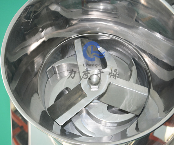 物料经进料进入旋转转鼓,主轴带动刮刀旋转,物料受离心力贴鼓壁,被刮刀挤压剪切成型,筛网出料得颗粒。