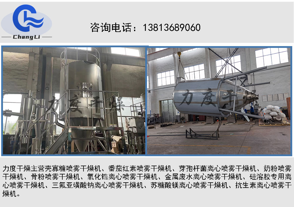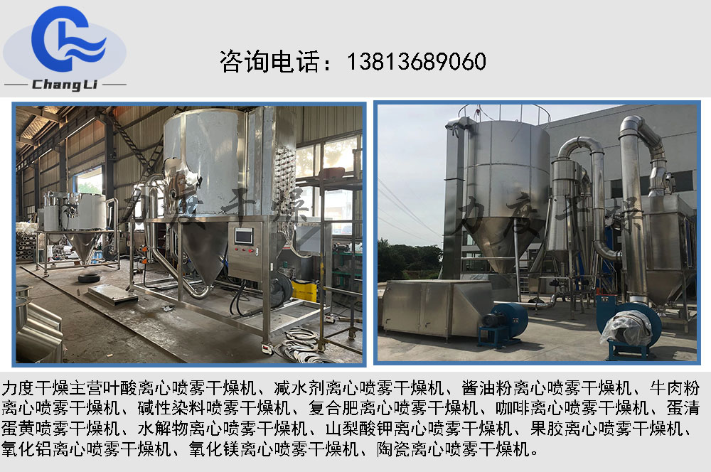 空气通过过滤器和加热装置后,进入干燥室顶部的进风分配器,通过进风分配器的热空气呈螺旋状均匀地进入塔内,同时由螺杆泵将料液送到装在塔体顶部的离心喷雾头,料液被雾化成极小的雾状液滴,使料液和热空气接触的表面积大大增加,小液滴和热风并流下沉,水份迅速蒸发在极短的时间内被干燥为粉粒制品,在塔底和旋风分离器中捕集,废气排至外界。